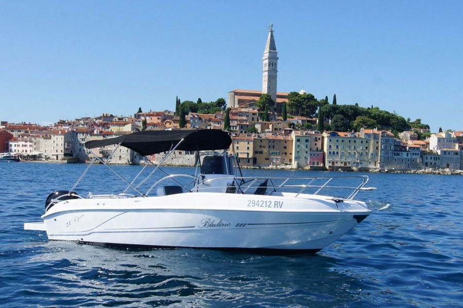 Rent a speedboat Bluline 21 2, max 8 persons, length: 6.5 meters, engine: Suzuki 150 hp, max speed: 60 km/h. Rent for 1 day or up to 7 days on the beach Žal in Prižba and in the village Karbuni. Charter transfer to Mljet, Hvar, Vis, Lastovo.
